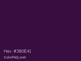 Hex #380e41 Color is a very dark purple color and the nearest color is Valentino #350e42. Hex code #380e41 and RGB value is rgb(56,14,65). In RGB color space, this color is composed of 22% red, 5% green, 25% blue, In CMYK color space, this color is composed of 14% cyan, 78% magenta, 0% yellow , 75% black , In HSL color space, this color has a hue angle of 289° , 65% saturation and 15% lightness.