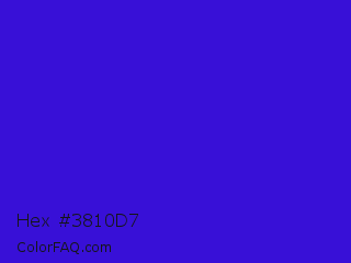 Hex #3810d7 Color is a normal indigo color and the nearest color is Interdimensional Blue #360ccc. Hex code #3810d7 and RGB value is rgb(56,16,215). In RGB color space, this color is composed of 22% red, 6% green, 84% blue, In CMYK color space, this color is composed of 74% cyan, 93% magenta, 0% yellow , 16% black , In HSL color space, this color has a hue angle of 252° , 86% saturation and 45% lightness.
