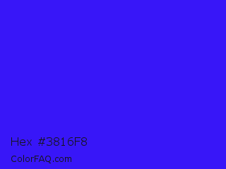Hex #3816f8 Color is a normal indigo color and the nearest color is Electric Ultramarine #3f00ff. Hex code #3816f8 and RGB value is rgb(56,22,248). In RGB color space, this color is composed of 22% red, 9% green, 97% blue, In CMYK color space, this color is composed of 77% cyan, 91% magenta, 0% yellow , 3% black , In HSL color space, this color has a hue angle of 249° , 94% saturation and 53% lightness.