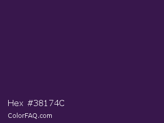 Hex #38174c Color is a very dark purple color and the nearest color is Deep Grape #381a51. Hex code #38174c and RGB value is rgb(56,23,76). In RGB color space, this color is composed of 22% red, 9% green, 30% blue, In CMYK color space, this color is composed of 26% cyan, 70% magenta, 0% yellow , 70% black , In HSL color space, this color has a hue angle of 277° , 54% saturation and 19% lightness.