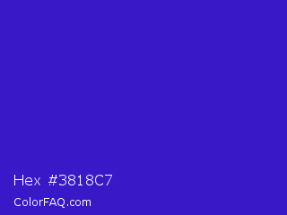 Hex #3818c7 Color is a normal indigo color and the nearest color is Interdimensional Blue #360ccc. Hex code #3818c7 and RGB value is rgb(56,24,199). In RGB color space, this color is composed of 22% red, 9% green, 78% blue, In CMYK color space, this color is composed of 72% cyan, 88% magenta, 0% yellow , 22% black , In HSL color space, this color has a hue angle of 251° , 78% saturation and 44% lightness.
