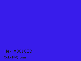 Hex #381ceb Color is a normal indigo color and the nearest color is Bluebonnet #1c1cf0. Hex code #381ceb and RGB value is rgb(56,28,235). In RGB color space, this color is composed of 22% red, 11% green, 92% blue, In CMYK color space, this color is composed of 76% cyan, 88% magenta, 0% yellow , 8% black , In HSL color space, this color has a hue angle of 248° , 84% saturation and 52% lightness.