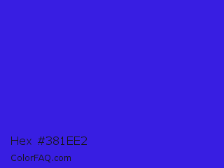 Hex #381ee2 Color is a normal indigo color and the nearest color is Interdimensional Blue #360ccc. Hex code #381ee2 and RGB value is rgb(56,30,226). In RGB color space, this color is composed of 22% red, 12% green, 89% blue, In CMYK color space, this color is composed of 75% cyan, 87% magenta, 0% yellow , 11% black , In HSL color space, this color has a hue angle of 248° , 77% saturation and 50% lightness.