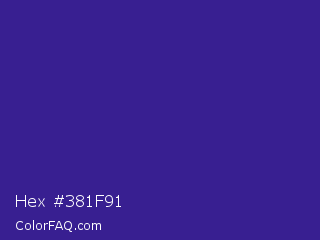 Hex #381f91 Color is a normal indigo color and the nearest color is Pixie Powder #391285. Hex code #381f91 and RGB value is rgb(56,31,145). In RGB color space, this color is composed of 22% red, 12% green, 57% blue, In CMYK color space, this color is composed of 61% cyan, 79% magenta, 0% yellow , 43% black , In HSL color space, this color has a hue angle of 253° , 65% saturation and 35% lightness.