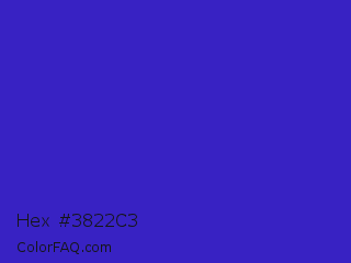 Hex #3822c3 Color is a normal indigo color and the nearest color is Interdimensional Blue #360ccc. Hex code #3822c3 and RGB value is rgb(56,34,195). In RGB color space, this color is composed of 22% red, 13% green, 76% blue, In CMYK color space, this color is composed of 71% cyan, 83% magenta, 0% yellow , 24% black , In HSL color space, this color has a hue angle of 248° , 70% saturation and 45% lightness.
