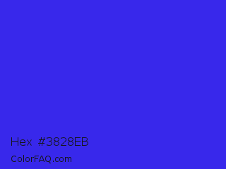 Hex #3828eb Color is a normal indigo color and the nearest color is Palatinate Blue #273be2. Hex code #3828eb and RGB value is rgb(56,40,235). In RGB color space, this color is composed of 22% red, 16% green, 92% blue, In CMYK color space, this color is composed of 76% cyan, 83% magenta, 0% yellow , 8% black , In HSL color space, this color has a hue angle of 245° , 83% saturation and 54% lightness.