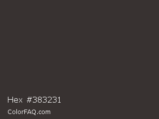 Hex #383231 Color is a very dark red color and the nearest color is Dune #383533. Hex code #383231 and RGB value is rgb(56,50,49). In RGB color space, this color is composed of 22% red, 20% green, 19% blue, In CMYK color space, this color is composed of 0% cyan, 11% magenta, 13% yellow , 78% black , In HSL color space, this color has a hue angle of 9° , 7% saturation and 21% lightness.