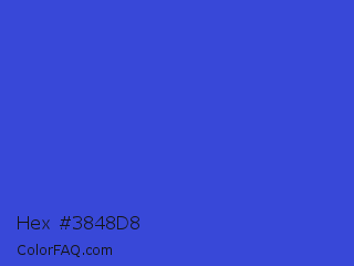 Hex #3848d8 Color is a normal blue color and the nearest color is Palatinate Blue #273be2. Hex code #3848d8 and RGB value is rgb(56,72,216). In RGB color space, this color is composed of 22% red, 28% green, 85% blue, In CMYK color space, this color is composed of 74% cyan, 67% magenta, 0% yellow , 15% black , In HSL color space, this color has a hue angle of 234° , 67% saturation and 53% lightness.