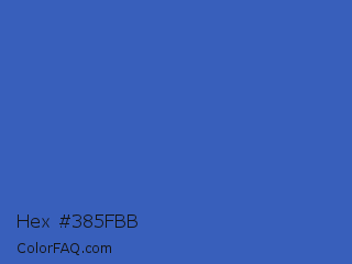 Hex #385fbb Color is a normal blue color and the nearest color is Cerulean Blue #2a52be. Hex code #385fbb and RGB value is rgb(56,95,187). In RGB color space, this color is composed of 22% red, 37% green, 73% blue, In CMYK color space, this color is composed of 70% cyan, 49% magenta, 0% yellow , 27% black , In HSL color space, this color has a hue angle of 222° , 54% saturation and 48% lightness.