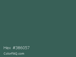 Hex #386057 Color is a dark cyan color and the nearest color is Stromboli #325d52. Hex code #386057 and RGB value is rgb(56,96,87). In RGB color space, this color is composed of 22% red, 38% green, 34% blue, In CMYK color space, this color is composed of 42% cyan, 0% magenta, 9% yellow , 62% black , In HSL color space, this color has a hue angle of 167° , 26% saturation and 30% lightness.