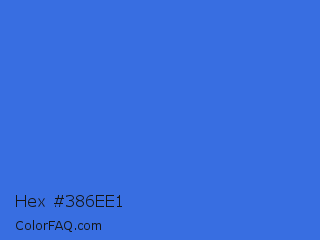 Hex #386ee1 Color is a normal blue color and the nearest color is Royal Blue #4169e1. Hex code #386ee1 and RGB value is rgb(56,110,225). In RGB color space, this color is composed of 22% red, 43% green, 88% blue, In CMYK color space, this color is composed of 75% cyan, 51% magenta, 0% yellow , 12% black , In HSL color space, this color has a hue angle of 221° , 74% saturation and 55% lightness.