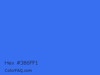 Hex #386ff1 Color is a normal blue color and the nearest color is Ultramarine Blue #4166f5. Hex code #386ff1 and RGB value is rgb(56,111,241). In RGB color space, this color is composed of 22% red, 44% green, 95% blue, In CMYK color space, this color is composed of 77% cyan, 54% magenta, 0% yellow , 5% black , In HSL color space, this color has a hue angle of 222° , 87% saturation and 58% lightness.
