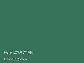 Hex #38725b Color is a normal green color and the nearest color is Amazon #3b7a57. Hex code #38725b and RGB value is rgb(56,114,91). In RGB color space, this color is composed of 22% red, 45% green, 36% blue, In CMYK color space, this color is composed of 51% cyan, 0% magenta, 20% yellow , 55% black , In HSL color space, this color has a hue angle of 156° , 34% saturation and 33% lightness.