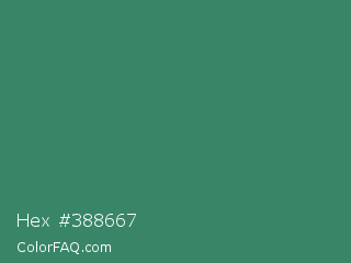 Hex #388667 Color is a normal green color and the nearest color is Viridian #40826d. Hex code #388667 and RGB value is rgb(56,134,103). In RGB color space, this color is composed of 22% red, 53% green, 40% blue, In CMYK color space, this color is composed of 58% cyan, 0% magenta, 23% yellow , 47% black , In HSL color space, this color has a hue angle of 156° , 41% saturation and 37% lightness.