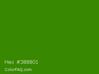 Hex #388801 Color is a dark green color and the nearest color is Napier Green #2a8000. Hex code #388801 and RGB value is rgb(56,136,1). In RGB color space, this color is composed of 22% red, 53% green, 0% blue, In CMYK color space, this color is composed of 59% cyan, 0% magenta, 99% yellow , 47% black , In HSL color space, this color has a hue angle of 96° , 99% saturation and 27% lightness.