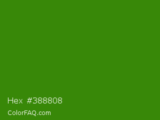 Hex #388808 Color is a dark green color and the nearest color is La Palma #368716. Hex code #388808 and RGB value is rgb(56,136,8). In RGB color space, this color is composed of 22% red, 53% green, 3% blue, In CMYK color space, this color is composed of 59% cyan, 0% magenta, 94% yellow , 47% black , In HSL color space, this color has a hue angle of 98° , 89% saturation and 28% lightness.