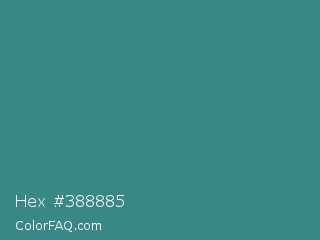 Hex #388885 Color is a normal cyan color and the nearest color is Lochinvar #2c8c84. Hex code #388885 and RGB value is rgb(56,136,133). In RGB color space, this color is composed of 22% red, 53% green, 52% blue, In CMYK color space, this color is composed of 59% cyan, 0% magenta, 2% yellow , 47% black , In HSL color space, this color has a hue angle of 178° , 42% saturation and 38% lightness.