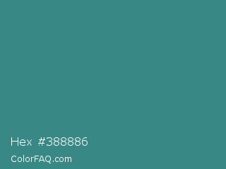 Hex #388886 Color is a normal cyan color and the nearest color is Lochinvar #2c8c84. Hex code #388886 and RGB value is rgb(56,136,134). In RGB color space, this color is composed of 22% red, 53% green, 53% blue, In CMYK color space, this color is composed of 59% cyan, 0% magenta, 1% yellow , 47% black , In HSL color space, this color has a hue angle of 179° , 42% saturation and 38% lightness.