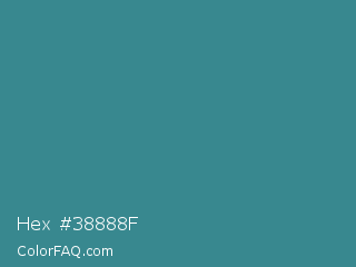 Hex #38888f Color is a normal cyan color and the nearest color is Lochinvar #2c8c84. Hex code #38888f and RGB value is rgb(56,136,143). In RGB color space, this color is composed of 22% red, 53% green, 56% blue, In CMYK color space, this color is composed of 61% cyan, 5% magenta, 0% yellow , 44% black , In HSL color space, this color has a hue angle of 185° , 44% saturation and 39% lightness.