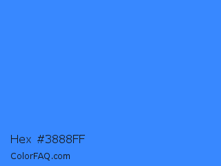 Hex #3888ff Color is a light blue color and the nearest color is Brilliant Azure #3399ff. Hex code #3888ff and RGB value is rgb(56,136,255). In RGB color space, this color is composed of 22% red, 53% green, 100% blue, In CMYK color space, this color is composed of 78% cyan, 47% magenta, 0% yellow , 0% black , In HSL color space, this color has a hue angle of 216° , 100% saturation and 61% lightness.