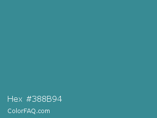 Hex #388b94 Color is a normal cyan color and the nearest color is Astral #327da0. Hex code #388b94 and RGB value is rgb(56,139,148). In RGB color space, this color is composed of 22% red, 55% green, 58% blue, In CMYK color space, this color is composed of 62% cyan, 6% magenta, 0% yellow , 42% black , In HSL color space, this color has a hue angle of 186° , 45% saturation and 40% lightness.