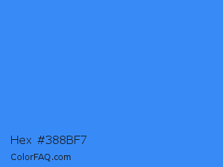 Hex #388bf7 Color is a normal blue color and the nearest color is Brilliant Azure #3399ff. Hex code #388bf7 and RGB value is rgb(56,139,247). In RGB color space, this color is composed of 22% red, 55% green, 97% blue, In CMYK color space, this color is composed of 77% cyan, 44% magenta, 0% yellow , 3% black , In HSL color space, this color has a hue angle of 214° , 92% saturation and 59% lightness.