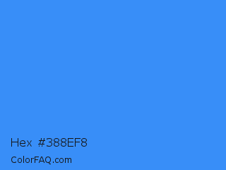 Hex #388ef8 Color is a normal blue color and the nearest color is Brilliant Azure #3399ff. Hex code #388ef8 and RGB value is rgb(56,142,248). In RGB color space, this color is composed of 22% red, 56% green, 97% blue, In CMYK color space, this color is composed of 77% cyan, 43% magenta, 0% yellow , 3% black , In HSL color space, this color has a hue angle of 213° , 93% saturation and 60% lightness.