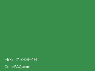 Hex #388f4b Color is a normal green color and the nearest color is Sea Green #2e8b57. Hex code #388f4b and RGB value is rgb(56,143,75). In RGB color space, this color is composed of 22% red, 56% green, 29% blue, In CMYK color space, this color is composed of 61% cyan, 0% magenta, 48% yellow , 44% black , In HSL color space, this color has a hue angle of 133° , 44% saturation and 39% lightness.