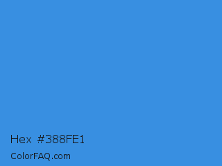 Hex #388fe1 Color is a normal blue color and the nearest color is Tufts Blue #3e8ede. Hex code #388fe1 and RGB value is rgb(56,143,225). In RGB color space, this color is composed of 22% red, 56% green, 88% blue, In CMYK color space, this color is composed of 75% cyan, 36% magenta, 0% yellow , 12% black , In HSL color space, this color has a hue angle of 209° , 74% saturation and 55% lightness.