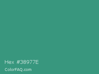 Hex #38977e Color is a normal cyan color and the nearest color is Illuminating Emerald #319177. Hex code #38977e and RGB value is rgb(56,151,126). In RGB color space, this color is composed of 22% red, 59% green, 49% blue, In CMYK color space, this color is composed of 63% cyan, 0% magenta, 17% yellow , 41% black , In HSL color space, this color has a hue angle of 164° , 46% saturation and 41% lightness.