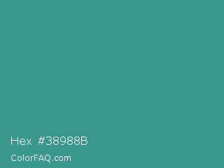 Hex #38988b Color is a normal cyan color and the nearest color is Zomp #39a78e. Hex code #38988b and RGB value is rgb(56,152,139). In RGB color space, this color is composed of 22% red, 60% green, 55% blue, In CMYK color space, this color is composed of 63% cyan, 0% magenta, 9% yellow , 40% black , In HSL color space, this color has a hue angle of 172° , 46% saturation and 41% lightness.