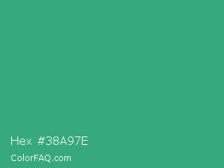 Hex #38a97e Color is a normal green color and the nearest color is Ocean Green #41aa78. Hex code #38a97e and RGB value is rgb(56,169,126). In RGB color space, this color is composed of 22% red, 66% green, 49% blue, In CMYK color space, this color is composed of 67% cyan, 0% magenta, 25% yellow , 34% black , In HSL color space, this color has a hue angle of 157° , 50% saturation and 44% lightness.
