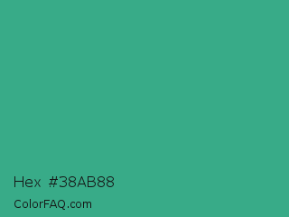 Hex #38ab88 Color is a normal green color and the nearest color is Zomp #39a78e. Hex code #38ab88 and RGB value is rgb(56,171,136). In RGB color space, this color is composed of 22% red, 67% green, 53% blue, In CMYK color space, this color is composed of 67% cyan, 0% magenta, 20% yellow , 33% black , In HSL color space, this color has a hue angle of 162° , 51% saturation and 45% lightness.