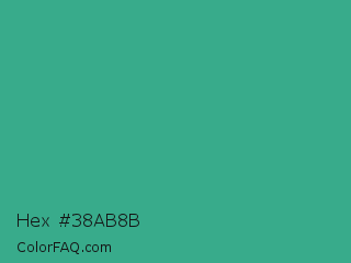 Hex #38ab8b Color is a normal green color and the nearest color is Zomp #39a78e. Hex code #38ab8b and RGB value is rgb(56,171,139). In RGB color space, this color is composed of 22% red, 67% green, 55% blue, In CMYK color space, this color is composed of 67% cyan, 0% magenta, 19% yellow , 33% black , In HSL color space, this color has a hue angle of 163° , 51% saturation and 45% lightness.