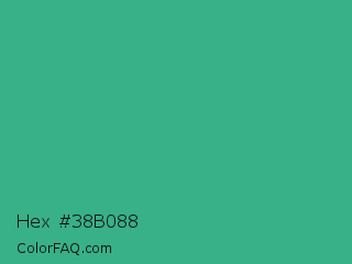 Hex #38b088 Color is a normal green color and the nearest color is Mint #3eb489. Hex code #38b088 and RGB value is rgb(56,176,136). In RGB color space, this color is composed of 22% red, 69% green, 53% blue, In CMYK color space, this color is composed of 68% cyan, 0% magenta, 23% yellow , 31% black , In HSL color space, this color has a hue angle of 160° , 52% saturation and 45% lightness.