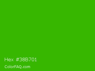 Hex #38b701 Color is a normal green color and the nearest color is Kelly Green #4cbb17. Hex code #38b701 and RGB value is rgb(56,183,1). In RGB color space, this color is composed of 22% red, 72% green, 0% blue, In CMYK color space, this color is composed of 69% cyan, 0% magenta, 99% yellow , 28% black , In HSL color space, this color has a hue angle of 102° , 99% saturation and 36% lightness.