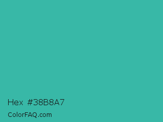 Hex #38b8a7 Color is a normal cyan color and the nearest color is Puerto Rico #3fc1aa. Hex code #38b8a7 and RGB value is rgb(56,184,167). In RGB color space, this color is composed of 22% red, 72% green, 65% blue, In CMYK color space, this color is composed of 70% cyan, 0% magenta, 9% yellow , 28% black , In HSL color space, this color has a hue angle of 172° , 53% saturation and 47% lightness.