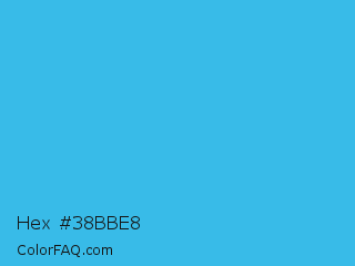 Hex #38bbe8 Color is a normal blue color and the nearest color is Picton Blue #45b1e8. Hex code #38bbe8 and RGB value is rgb(56,187,232). In RGB color space, this color is composed of 22% red, 73% green, 91% blue, In CMYK color space, this color is composed of 76% cyan, 19% magenta, 0% yellow , 9% black , In HSL color space, this color has a hue angle of 195° , 79% saturation and 56% lightness.