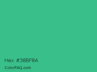 Hex #38bf8a Color is a normal green color and the nearest color is Mountain Meadow #30ba8f. Hex code #38bf8a and RGB value is rgb(56,191,138). In RGB color space, this color is composed of 22% red, 75% green, 54% blue, In CMYK color space, this color is composed of 71% cyan, 0% magenta, 28% yellow , 25% black , In HSL color space, this color has a hue angle of 156° , 55% saturation and 48% lightness.