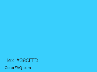 Hex #38cffd Color is a light blue color and the nearest color is Picton Blue #45b1e8. Hex code #38cffd and RGB value is rgb(56,207,253). In RGB color space, this color is composed of 22% red, 81% green, 99% blue, In CMYK color space, this color is composed of 78% cyan, 18% magenta, 0% yellow , 1% black , In HSL color space, this color has a hue angle of 194° , 98% saturation and 61% lightness.