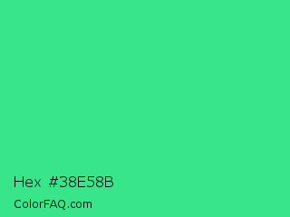 Hex #38e58b Color is a normal green color and the nearest color is Shamrock #33cc99. Hex code #38e58b and RGB value is rgb(56,229,139). In RGB color space, this color is composed of 22% red, 90% green, 55% blue, In CMYK color space, this color is composed of 76% cyan, 0% magenta, 39% yellow , 10% black , In HSL color space, this color has a hue angle of 149° , 77% saturation and 56% lightness.
