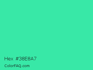 Hex #38e8a7 Color is a normal green color and the nearest color is Eucalyptus #44d7a8. Hex code #38e8a7 and RGB value is rgb(56,232,167). In RGB color space, this color is composed of 22% red, 91% green, 65% blue, In CMYK color space, this color is composed of 76% cyan, 0% magenta, 28% yellow , 9% black , In HSL color space, this color has a hue angle of 158° , 79% saturation and 56% lightness.