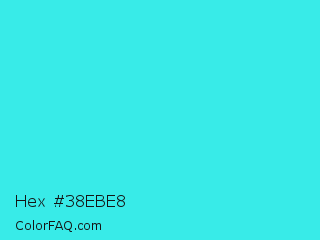 Hex #38ebe8 Color is a normal cyan color and the nearest color is Turquoise #40e0d0. Hex code #38ebe8 and RGB value is rgb(56,235,232). In RGB color space, this color is composed of 22% red, 92% green, 91% blue, In CMYK color space, this color is composed of 76% cyan, 0% magenta, 1% yellow , 8% black , In HSL color space, this color has a hue angle of 179° , 82% saturation and 57% lightness.