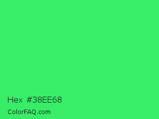 Hex #38ee68 Color is a normal green color and the nearest color is UFO Green #3cd070. Hex code #38ee68 and RGB value is rgb(56,238,104). In RGB color space, this color is composed of 22% red, 93% green, 41% blue, In CMYK color space, this color is composed of 76% cyan, 0% magenta, 56% yellow , 7% black , In HSL color space, this color has a hue angle of 136° , 84% saturation and 58% lightness.