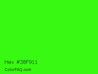 Hex #38f911 Color is a normal green color and the nearest color is Neon Green #39ff14. Hex code #38f911 and RGB value is rgb(56,249,17). In RGB color space, this color is composed of 22% red, 98% green, 7% blue, In CMYK color space, this color is composed of 78% cyan, 0% magenta, 93% yellow , 2% black , In HSL color space, this color has a hue angle of 110° , 95% saturation and 52% lightness.