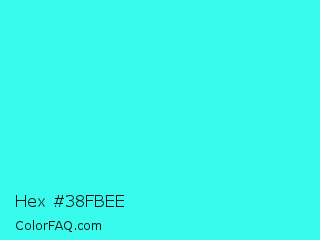 Hex #38fbee Color is a normal cyan color and the nearest color is Loeen #15f2fd. Hex code #38fbee and RGB value is rgb(56,251,238). In RGB color space, this color is composed of 22% red, 98% green, 93% blue, In CMYK color space, this color is composed of 78% cyan, 0% magenta, 5% yellow , 2% black , In HSL color space, this color has a hue angle of 176° , 96% saturation and 60% lightness.