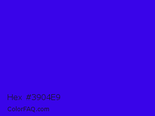 Hex #3904e9 Color is a normal indigo color and the nearest color is Electric Ultramarine #3f00ff. Hex code #3904e9 and RGB value is rgb(57,4,233). In RGB color space, this color is composed of 22% red, 2% green, 91% blue, In CMYK color space, this color is composed of 76% cyan, 98% magenta, 0% yellow , 9% black , In HSL color space, this color has a hue angle of 254° , 97% saturation and 46% lightness.