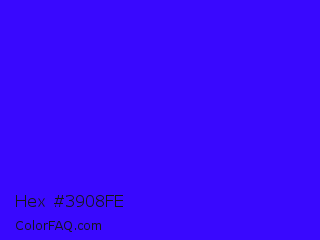 Hex #3908fe Color is a normal indigo color and the nearest color is Electric Ultramarine #3f00ff. Hex code #3908fe and RGB value is rgb(57,8,254). In RGB color space, this color is composed of 22% red, 3% green, 100% blue, In CMYK color space, this color is composed of 78% cyan, 97% magenta, 0% yellow , 0% black , In HSL color space, this color has a hue angle of 252° , 99% saturation and 51% lightness.