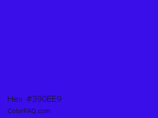 Hex #390ee9 Color is a normal indigo color and the nearest color is Electric Ultramarine #3f00ff. Hex code #390ee9 and RGB value is rgb(57,14,233). In RGB color space, this color is composed of 22% red, 5% green, 91% blue, In CMYK color space, this color is composed of 76% cyan, 94% magenta, 0% yellow , 9% black , In HSL color space, this color has a hue angle of 252° , 89% saturation and 48% lightness.
