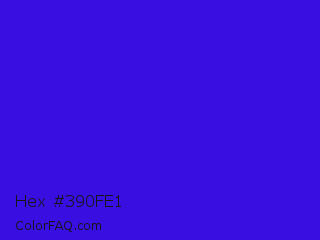 Hex #390fe1 Color is a normal indigo color and the nearest color is Interdimensional Blue #360ccc. Hex code #390fe1 and RGB value is rgb(57,15,225). In RGB color space, this color is composed of 22% red, 6% green, 88% blue, In CMYK color space, this color is composed of 75% cyan, 93% magenta, 0% yellow , 12% black , In HSL color space, this color has a hue angle of 252° , 88% saturation and 47% lightness.